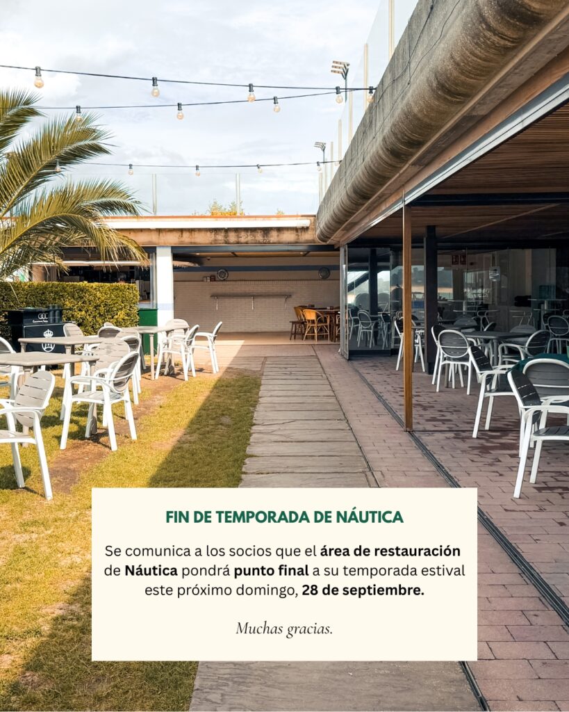 Se comunica a los socios que este próximo domingo, 28 de septiembre, el área de restauración de Náutica pondrá punto final a su temporada estival.