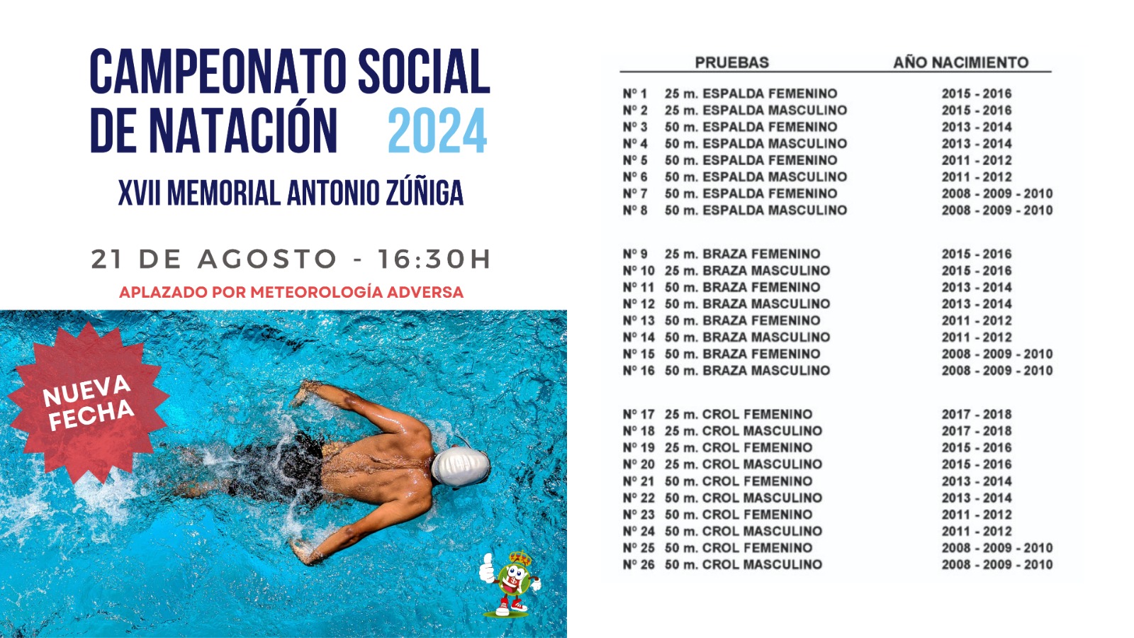 En la piscina del Club Juvenil, se celebrará el XVII Campeonato Social de Natación, Memorial Antonio Zúñiga.